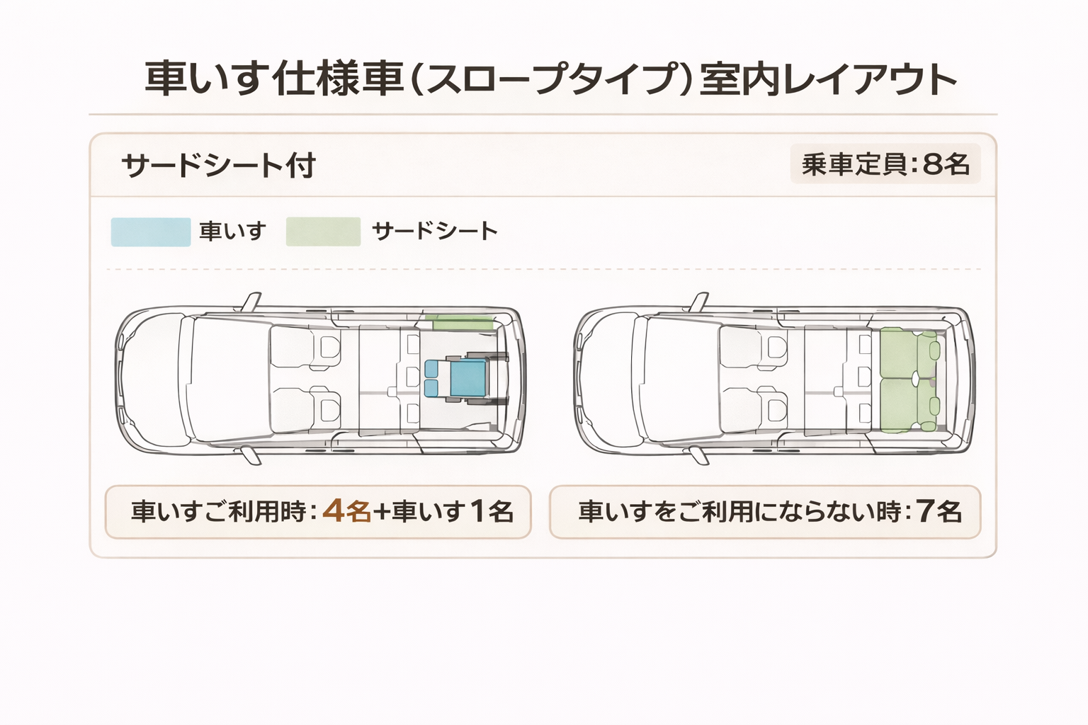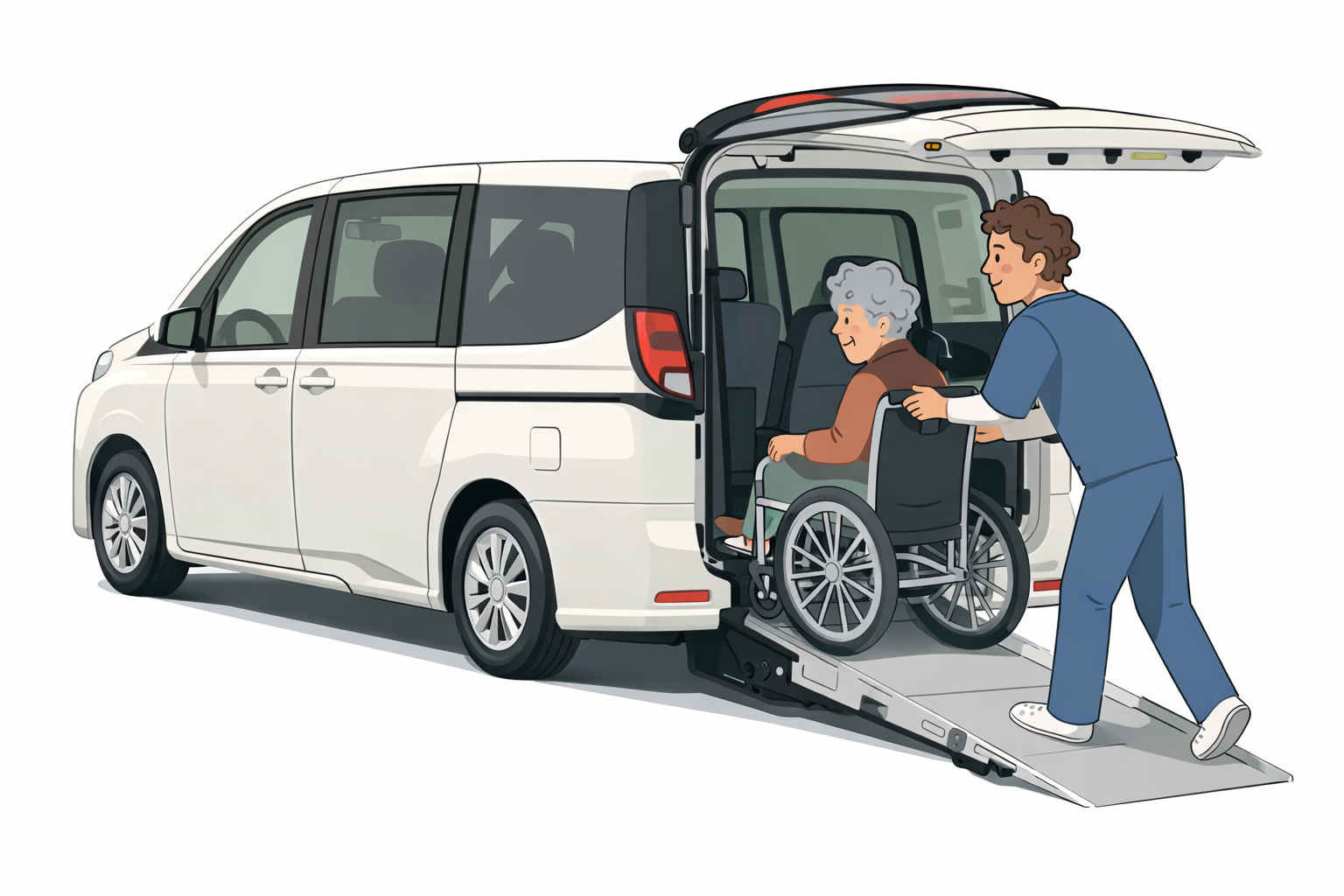 ミニバン車両で送迎いたします。車椅子を使用しての送迎の場合は、運転手1名を除き車椅子1名、歩ける方が4名で計5名のお客様が乗車可能です。お一人様からご利用が可能です。